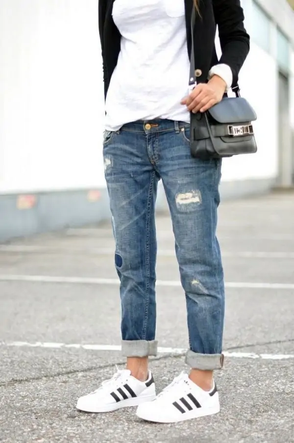 Cuff up your ripped jeans and put them on with your Adidas sneakers for the coolest swag outfit. Remember to lay off the socks for this look.
