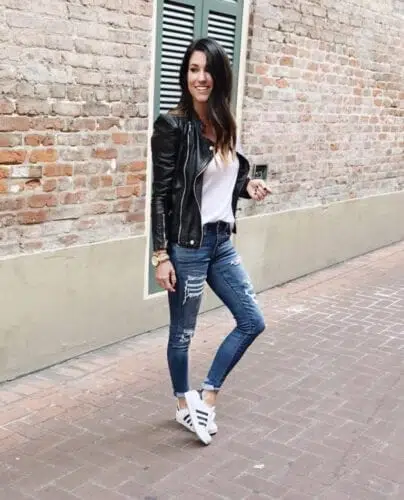 Black jeans and a leather jacket with your Adidas shoes are one of the easiest and yet the most stylish look. In this all-black outfit, you’re sure to turn all heads your way without even trying!