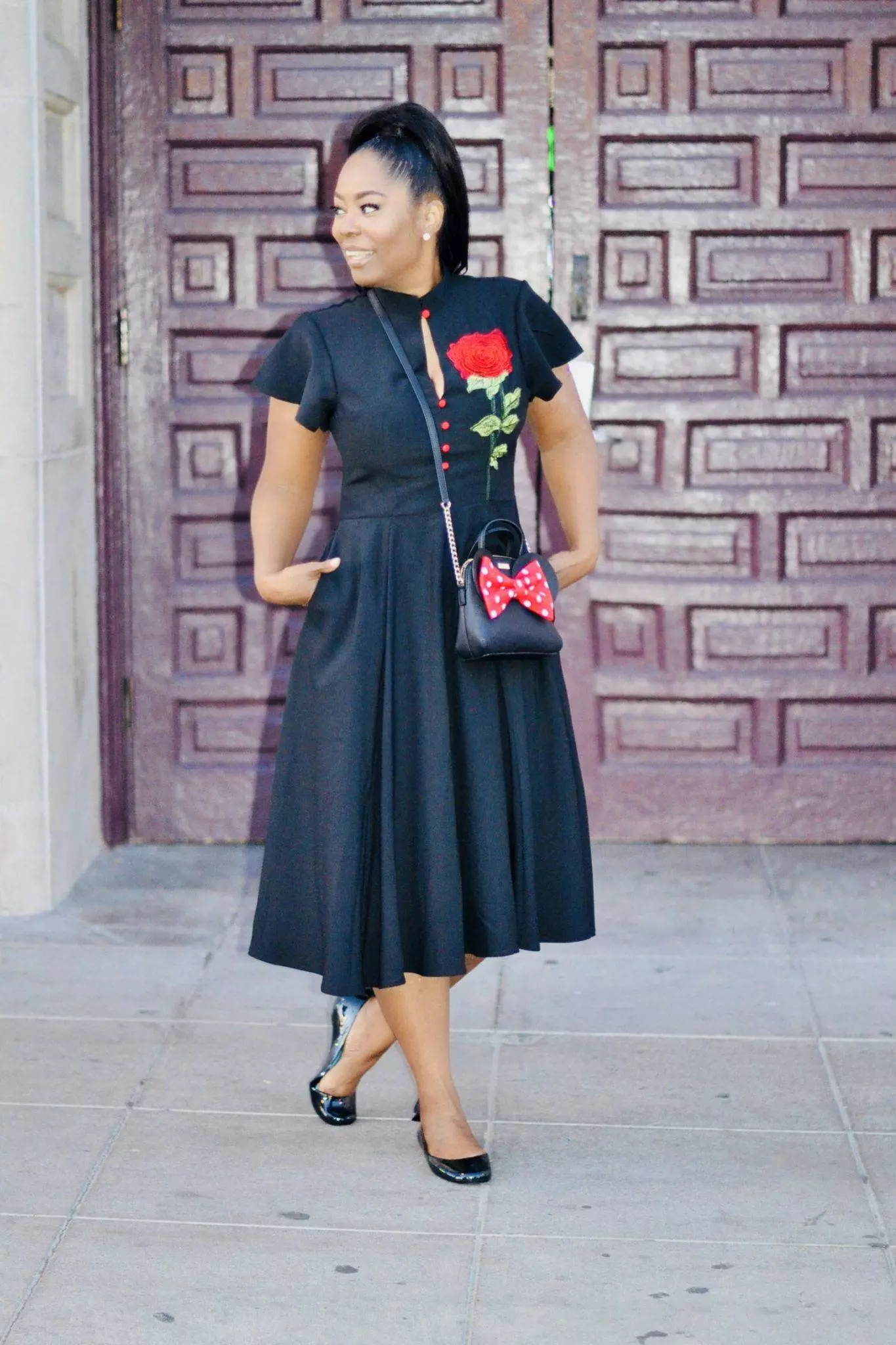 If you do not want to wear a completely plain dress, you can go for an embroidered dress such as this one with red rose embroidered on a black swing dress. It is easy to create this dress for yourself by taking some flower motifs and hot glue gun in your hand. The fitted waist and flared skirt of the dress create a playful look ideal for Easter. With high neck collar, dainty pearl earrings look pretty awesome. Tie your hair up in a ponytail for a sleek look.