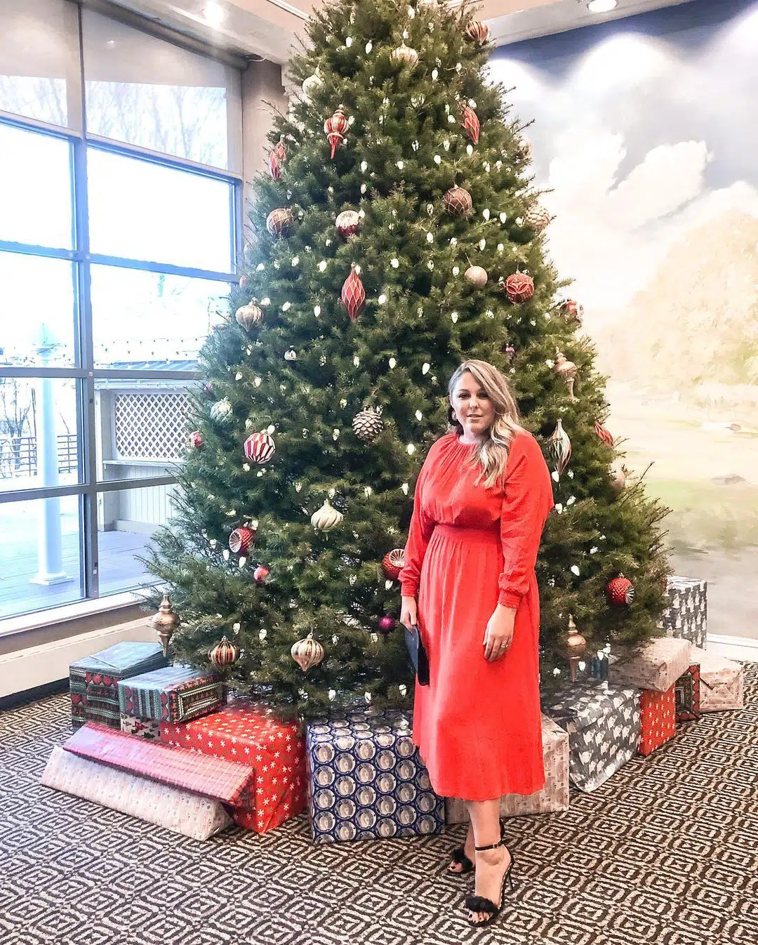 Here’s an idea for Christmas party attire. Wear a long red maxi dress to a Christmas party since red is a Christmas color. Complement your appearance with black fur heel shoes and a black bag that matches the sandals. Your fur-heeled Christmas attire is here.