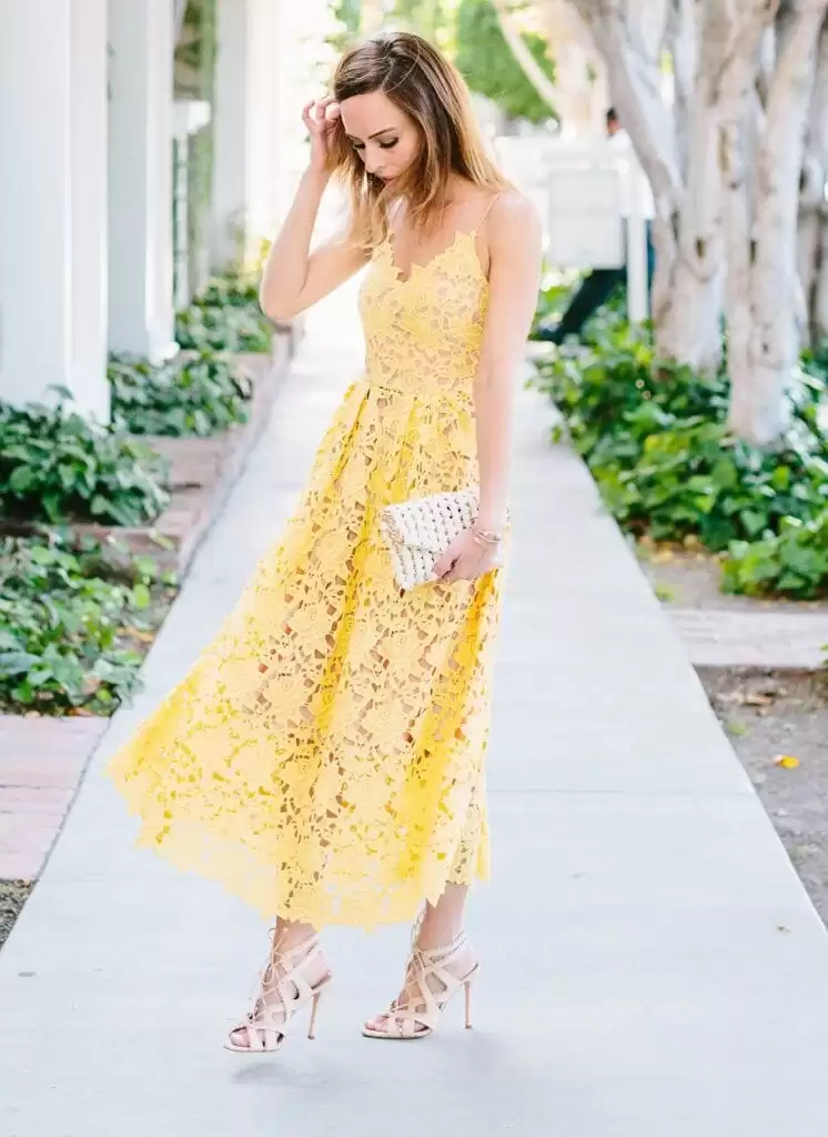 From daytime weddings to night dates, this yellow hue embellished in lace is the perfect outfit for all such events.