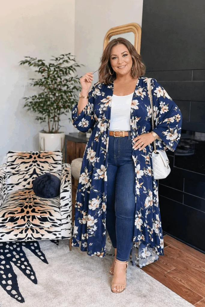 This navy floral duster coat worn over skinny jeans creates a modern layered look with the longer back hem adding drama and movement. The lightweight fabric and loose fit make it comfortable for all-day wear while still looking polished. This style works beautifully for women who want to experiment with trends like high-low hemlines in a wearable way.plus size over 50 style