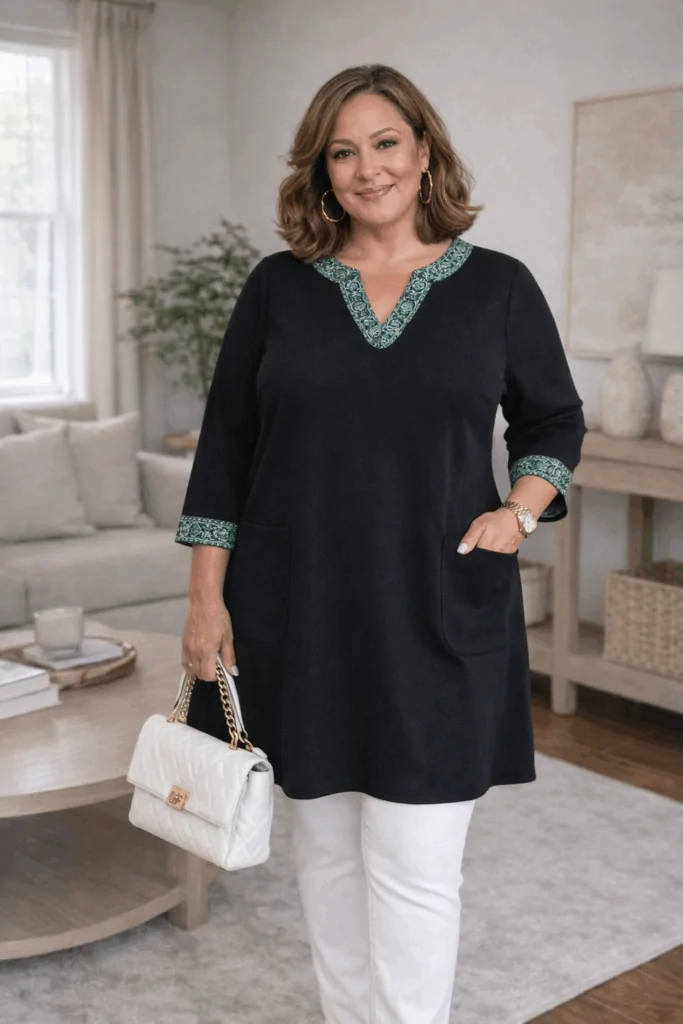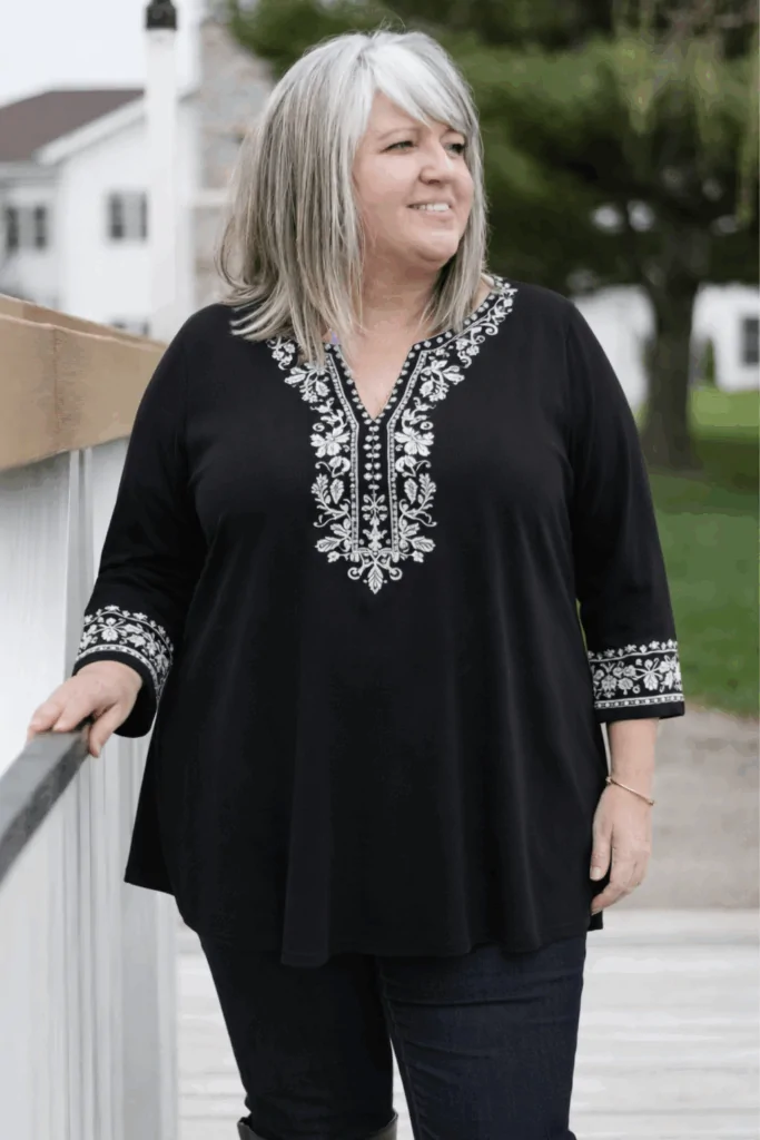 The three-quarter sleeves and intricate white embroidery on this black tunic create visual interest while the longer length provides coverage through the hip area. Paired with dark straight-leg jeans and tall boots, this combination offers comfort without sacrificing style. This look is ideal for casual outings where you want to feel put-together but relaxed.