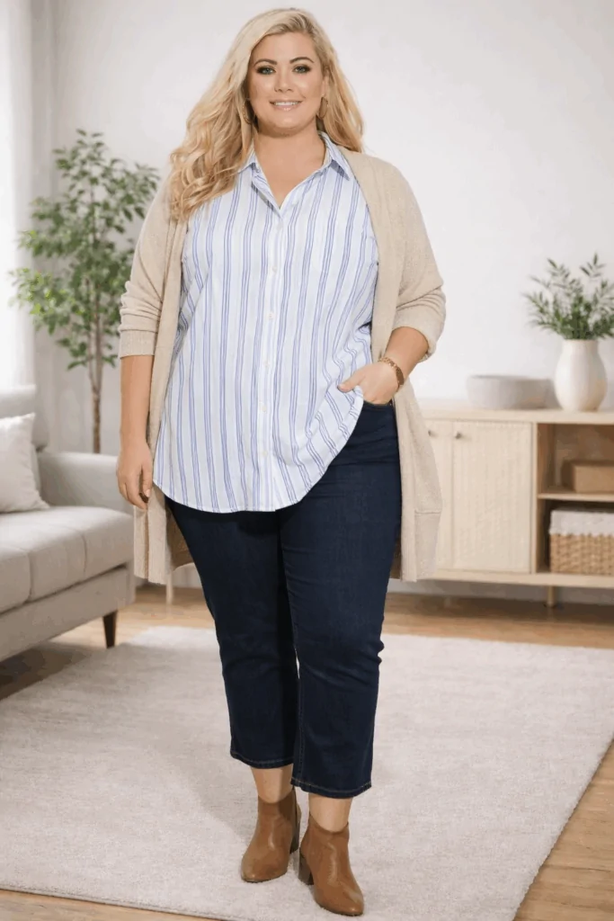This oversized striped shirt paired with dark cropped jeans creates a relaxed yet put-together look that works beautifully for plus-size women. The shirt’s loose fit skims the body without clinging, while the vertical stripes add visual length. Complete the look with brown ankle boots and a structured cardigan for errands or casual outings.