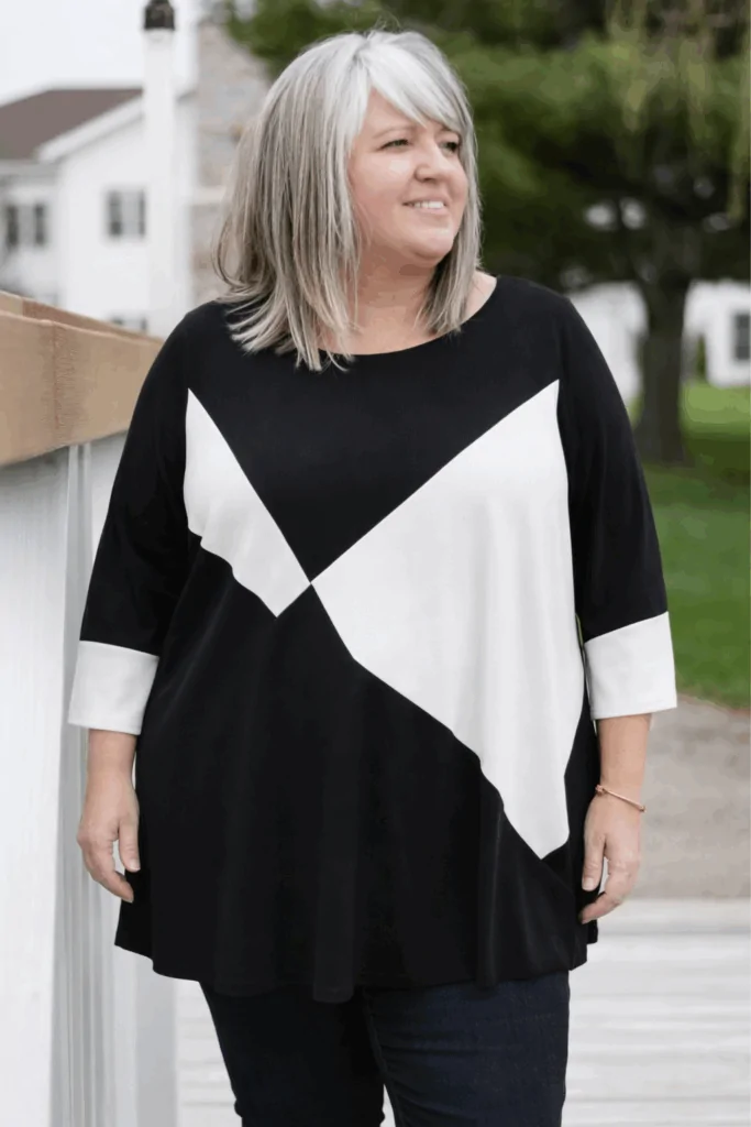 A dramatic black tunic with white contrast panels creates bold geometric lines that can be surprisingly flattering on plus-size figures. The asymmetrical white sections add visual interest while the overall loose fit ensures comfort. This statement piece works best when kept simple with black leggings and minimal accessories.
