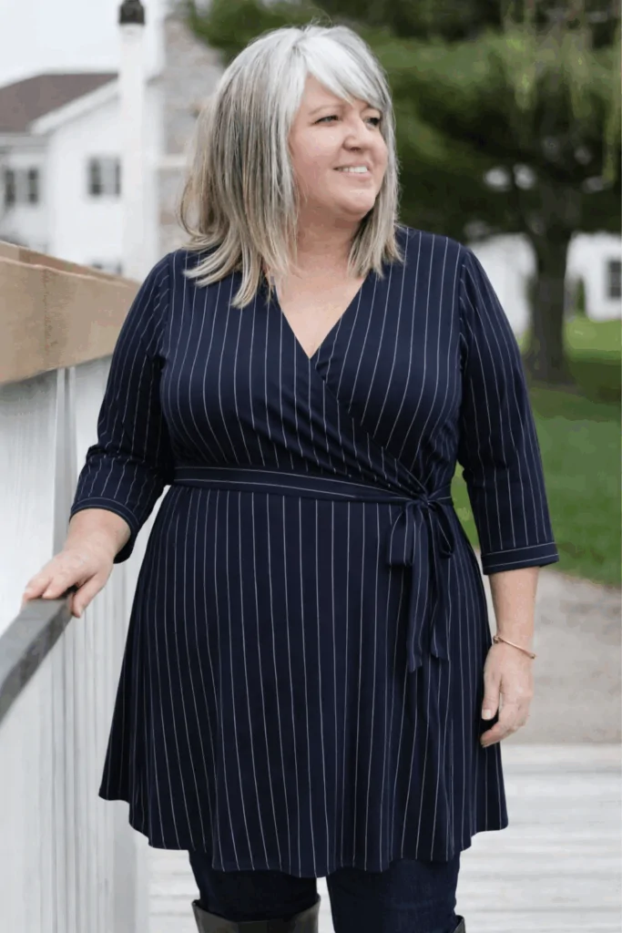 The pinstripe pattern creates vertical lines that are naturally flattering, while the wrap style allows for customized fit through the torso. The three-quarter sleeves provide coverage while still feeling current and polished. This dress style works exceptionally well for business casual settings or dinner occasions where you need to look polished but not overdressed.