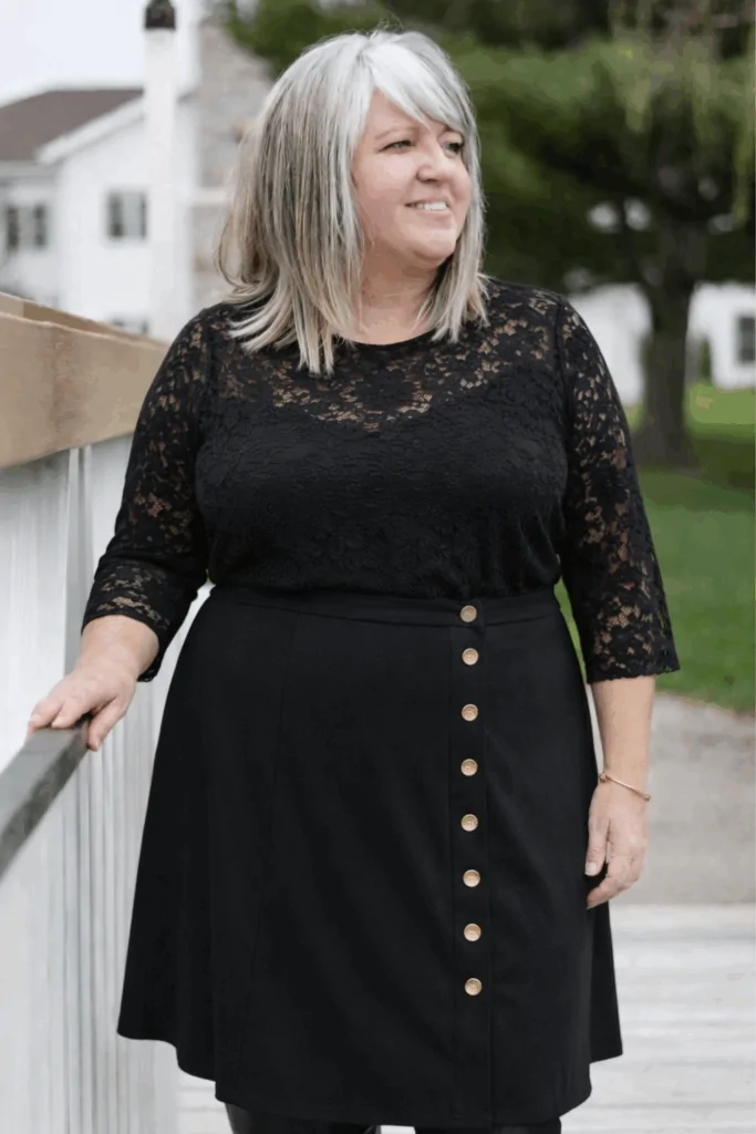 The contrast between the delicate lace top and structured button-front skirt creates an outfit with both texture and visual interest. Keeping everything in black allows the different textures to be the star rather than competing colors. The button detailing adds a modern touch while the midi length maintains sophistication.