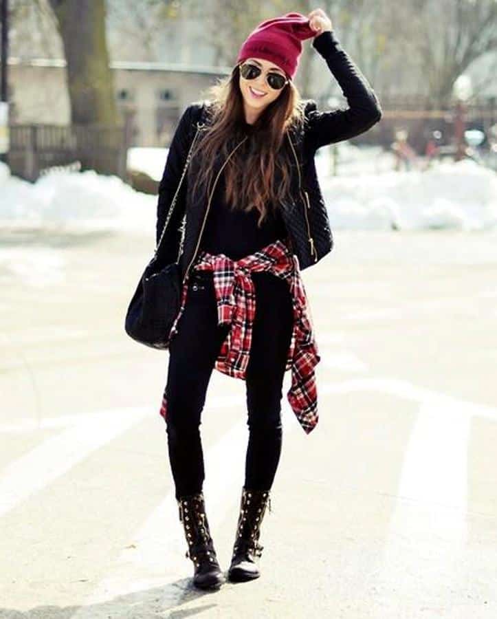 A classic black leather jacket paired with skinny jeans and combat boots gets personality from a rich burgundy beanie. The plaid flannel tied around the waist adds the essential grunge layering element while the beanie brings in that necessary ’90s streetwear influence.