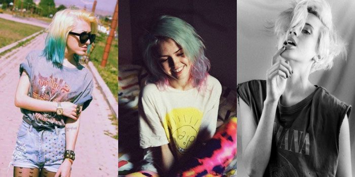 These looks prove that grunge isn’t limited to dark colors — pastel pink and mint green hair paired with band tees and ripped denim creates a softer take on the aesthetic. The key is keeping the clothing elements authentic while allowing the hair color to be the unexpected twist. This approach works for anyone who wants grunge style but prefers lighter, more playful colors.