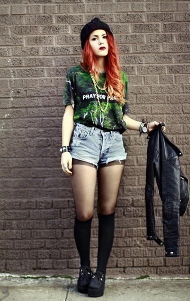 Tip: Tuck graphic tees into high-waisted bottoms to avoid the boxy, shapeless look that can make grunge outfits appear sloppy.