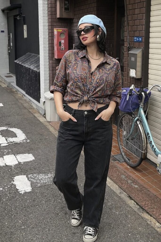 The tied paisley shirt creates shape while maintaining that casual grunge aesthetic, paired with straight-leg black jeans for a clean silhouette. Converse sneakers keep it authentically ’90s, while the vintage print adds visual interest without being loud. This outfit works for anyone wanting grunge that feels wearable for daily life.