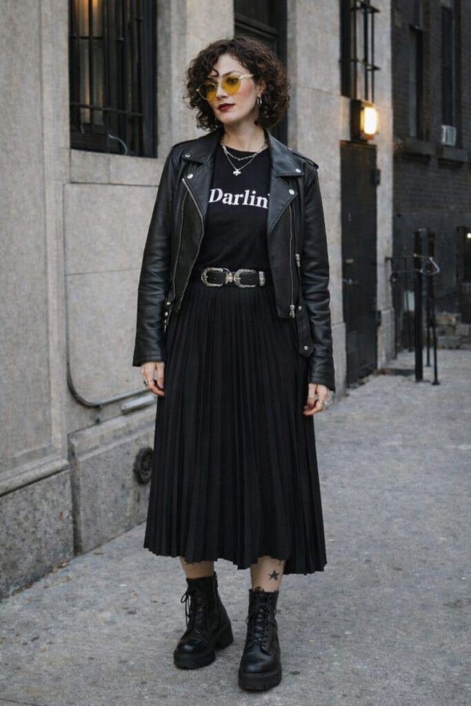 A black “Darlin” text tee paired with a dark pleated skirt and leather jacket creates a balanced grunge look. The mix of casual and slightly dressy pieces makes this outfit versatile enough for different occasions. The western-style belt adds an unexpected detail that elevates the basic combination.