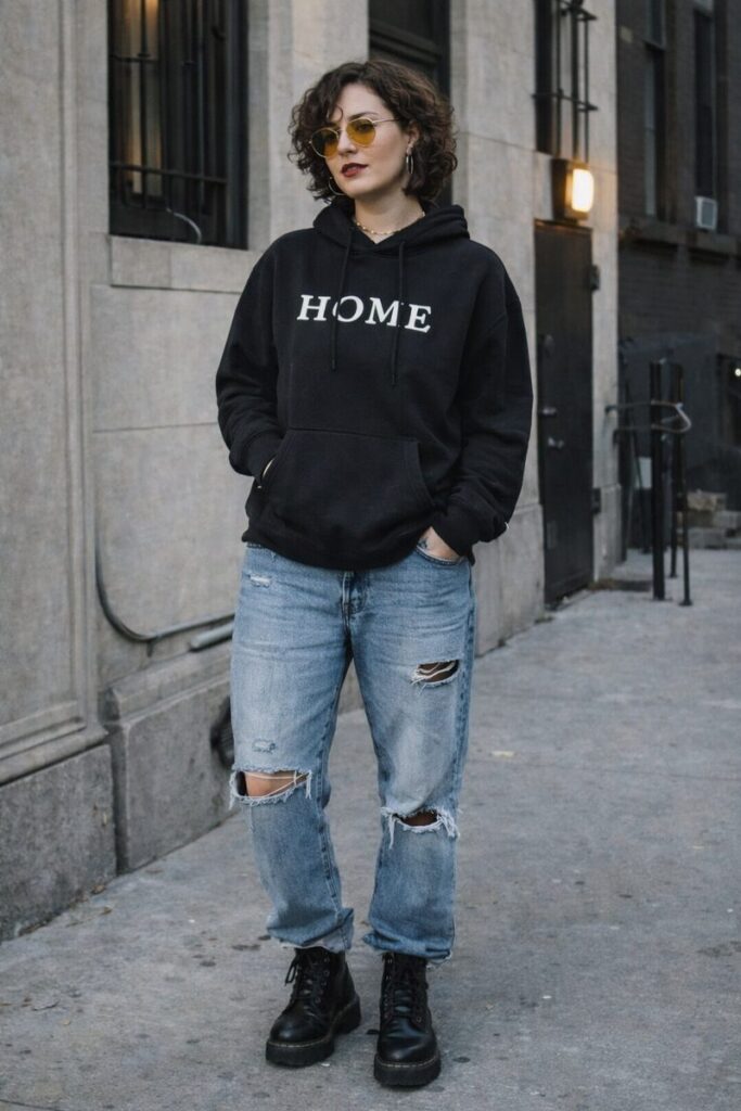 A simple black hoodie with “HOME” text and worn jeans creates an effortless grunge aesthetic. This combination prioritizes comfort while still maintaining the alternative style through the relaxed fit and casual styling. It’s ideal for someone who wants grunge influence in their everyday wardrobe without dramatic pieces.