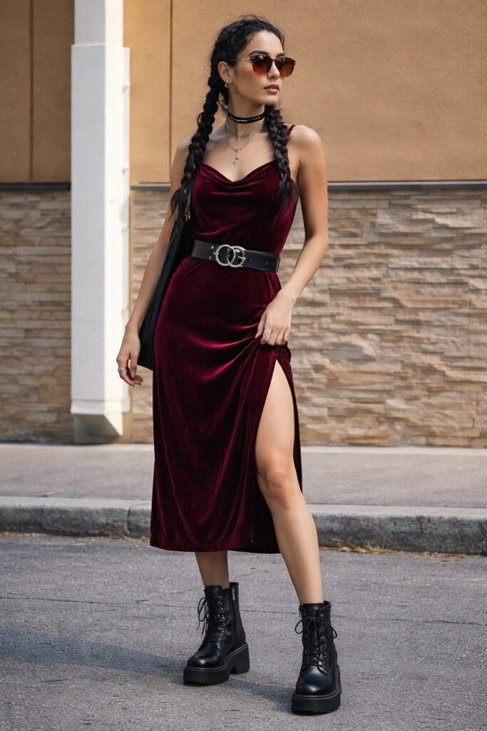 A burgundy velvet slip dress with a black belt creates a more feminine take on grunge styling. The rich texture and deep color maintain the dark, moody aesthetic while the dress silhouette adds elegance. This combination works well for evening events or when you want grunge influence in a dressier outfit.