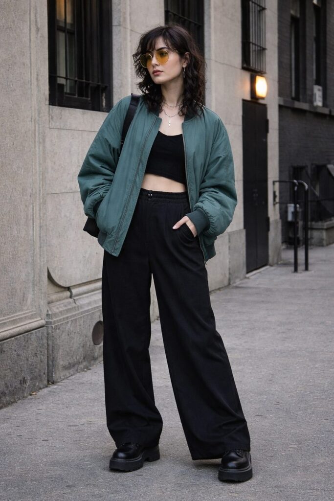 An oversized teal bomber jacket paired with black wide-leg pants creates a modern grunge silhouette. The loose proportions and casual styling capture the relaxed grunge aesthetic while the color adds visual interest. This works for someone who wants to incorporate grunge elements into a more contemporary wardrobe.