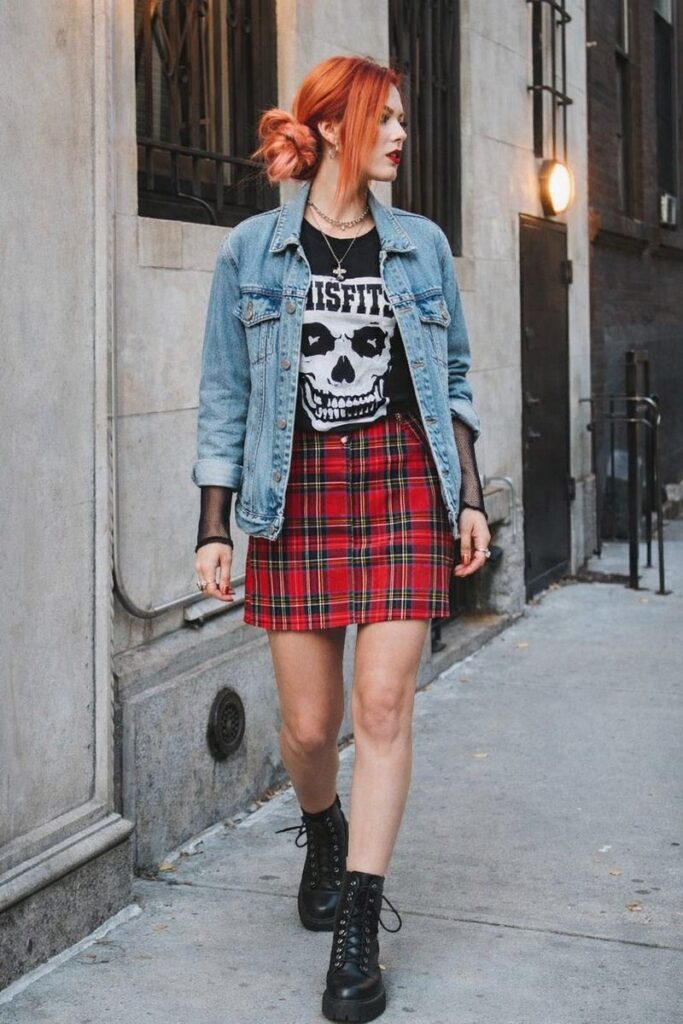 Red tartan plaid mini skirt paired with a black band tee, mesh sleeves, and lace-up ankle boots creates the perfect punk-grunge hybrid. The denim jacket adds a softer layer that keeps the look wearable rather than costume-y. This works best on petite to average frames where the mini skirt proportions won’t overwhelm.