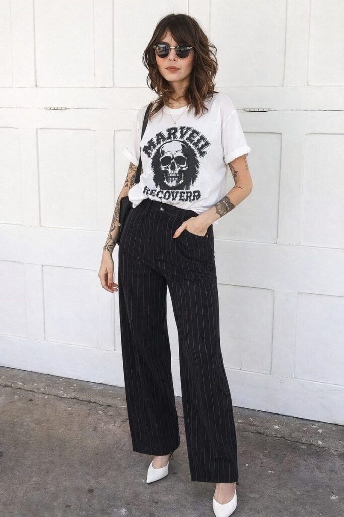 These matching pinstripe wide-leg jeans paired with graphic white shirts create a coordinated grunge look that feels fresh and modern. The high-waisted fit and dramatic flare balance the oversized shirt proportions, while white pointed heels add an unexpected polish that keeps the look from feeling too casual.
