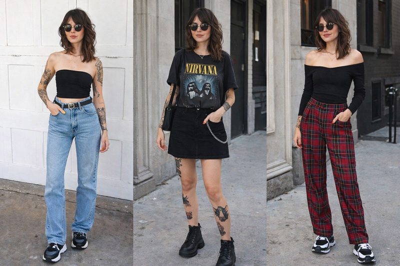 From a bandeau with high-waisted jeans to an off-shoulder top with plaid trousers, these looks show how versatile black basics can be in grunge styling. Each outfit uses different silhouettes but maintains that effortless, rebellious edge through relaxed fits and chunky sneakers.