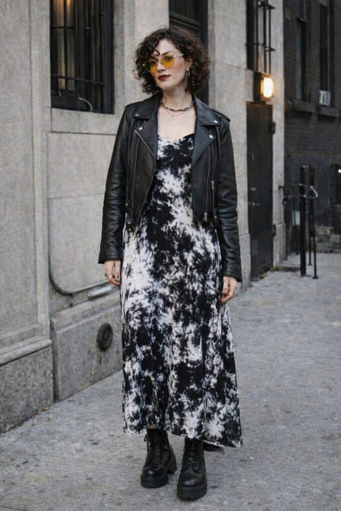 This black and white tie-dye maxi dress layered under a cropped leather jacket bridges the gap between grunge and bohemian style. The flowing dress softens the hard edge of the leather, while platform boots maintain the rebellious attitude essential to grunge.