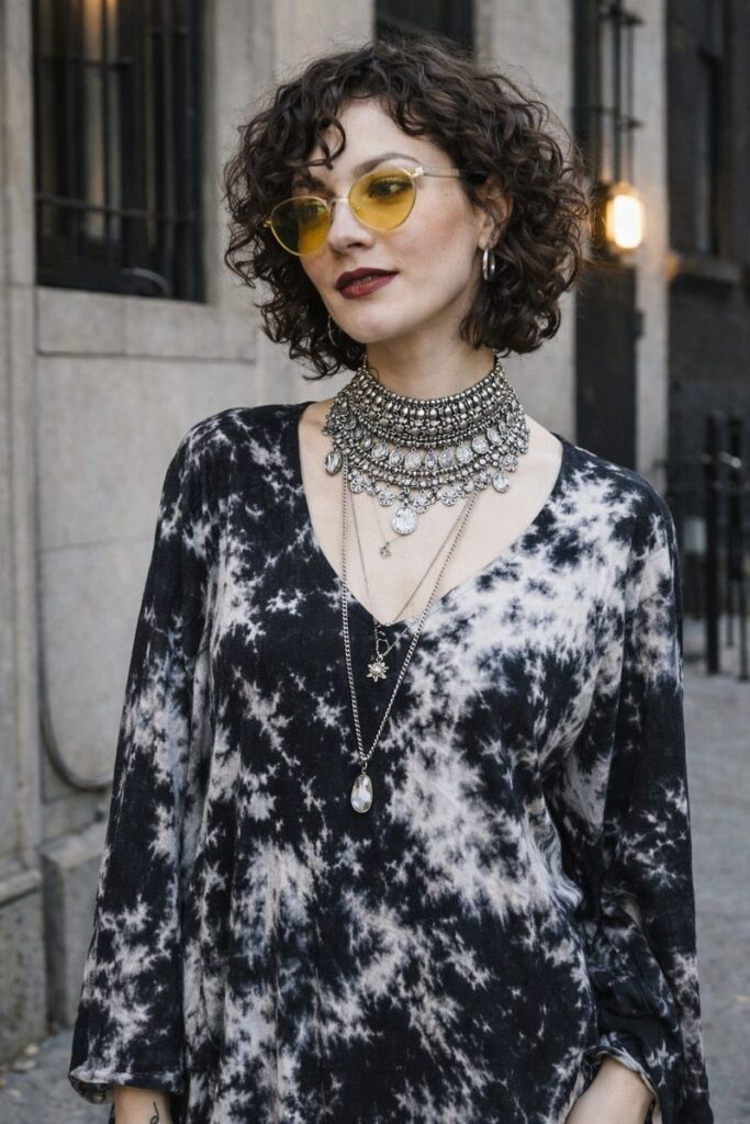An elaborate silver choker becomes the focal point of this grunge-meets-bohemian outfit featuring a tie-dye top and long necklaces. The heavy metal jewelry contrasts beautifully with the soft, flowing fabric, creating that perfect tension between tough and feminine that defines modern grunge.