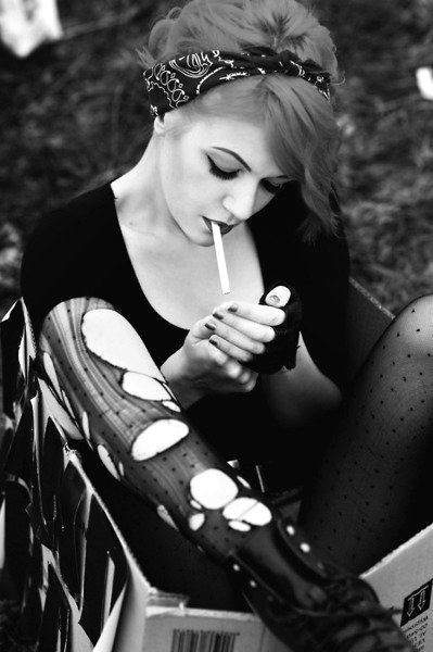 This grunge look pairs a printed bandana headband with sheer polka dot tights and a black top. The combination creates visual interest through pattern mixing while maintaining the dark, alternative aesthetic. This works well for someone who wants to add feminine details to their grunge style without losing the edge.