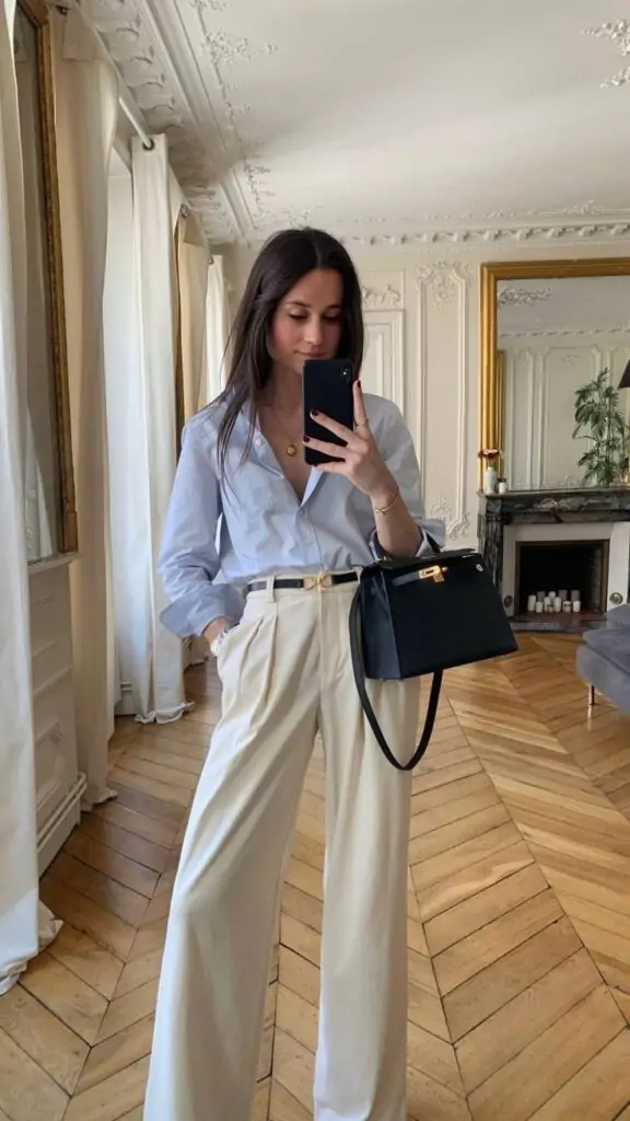11 – Cream Color Wide Leg Pants With White Button Down and Blue Vest