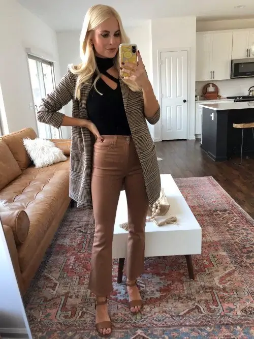Wear a tweed or woollen skirt or even a dress and an oversized sweater over it – this is a comfy and trendy combo. Try layered looks with skirt suits, or even go for a trendy knit suit with a skirt, which is all the rage right now. Add sneakers or boots, a coat and go! Here is a minimalist look with a camel linen skirt, a black sweater, and a tote bag with nude heels for an official meeting in the fall. You can complete this look with a top coat.