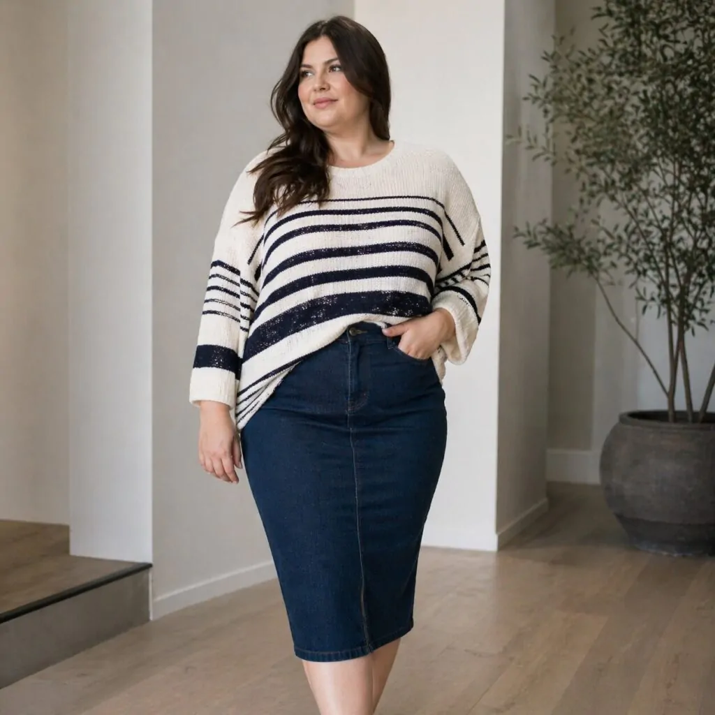 Don’t let anyone tell you that stripes and denim don’t mix — this outfit proves otherwise. The varying stripe widths create movement that draws the eye up and down rather than side to side, which is incredibly flattering. The oversized fit of this top works because it’s balanced by the fitted nature of the denim skirt. Keep accessories minimal when mixing patterns like this — let the contrast between the soft knit and structured denim be the star.