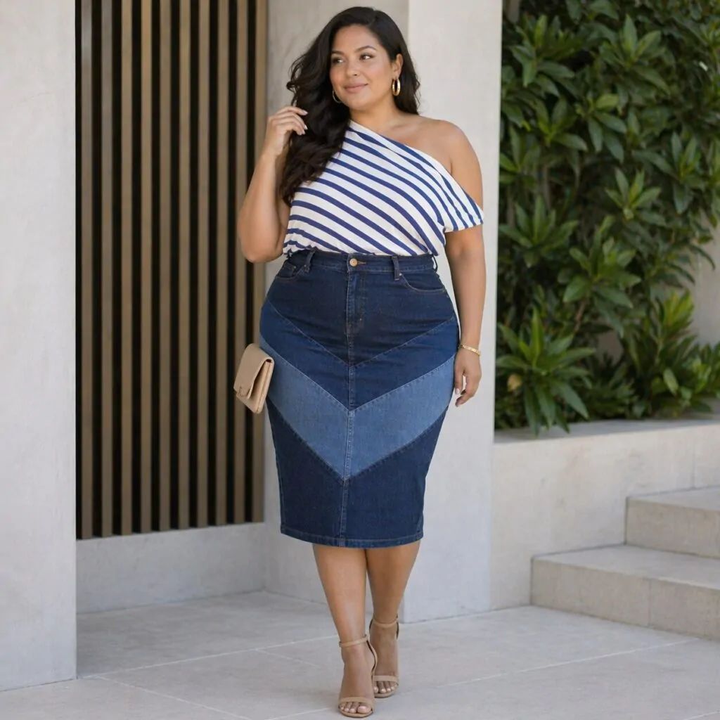 A diagonal striped one-shoulder top paired with a structured denim skirt featuring blue chevron panels creates visual interest without overwhelming the silhouette. The high-waisted fit and strategic color blocking work beautifully for curves, while strappy sandals keep the look polished. This outfit proves that mixing patterns can be incredibly flattering when done with confidence.