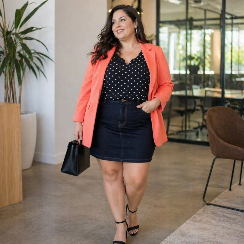 A vibrant coral blazer transforms a simple black polka dot top and dark denim mini skirt into an office-appropriate ensemble. The structured blazer shoulders create beautiful proportions, while the shorter skirt length shows off great legs. This combination works perfectly for women who want to add personality to professional wear without sacrificing polish.
