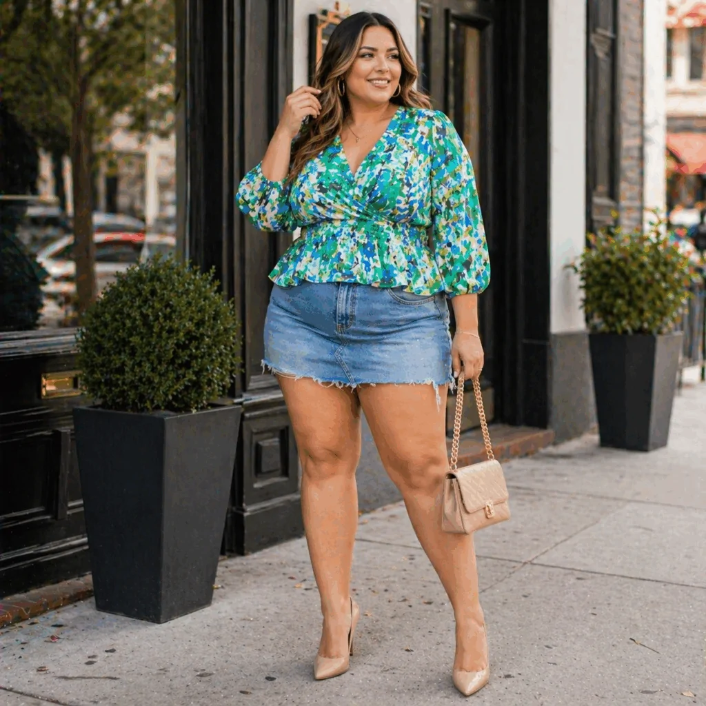 A printed peplum top paired with a classic denim mini creates instant waist definition that’s particularly flattering for plus-size figures. The peplum flare balances wider hips while the high-waisted denim mini shows off your legs. Nude pumps elongate the leg line and let the vibrant green and blue print be the star of the show.