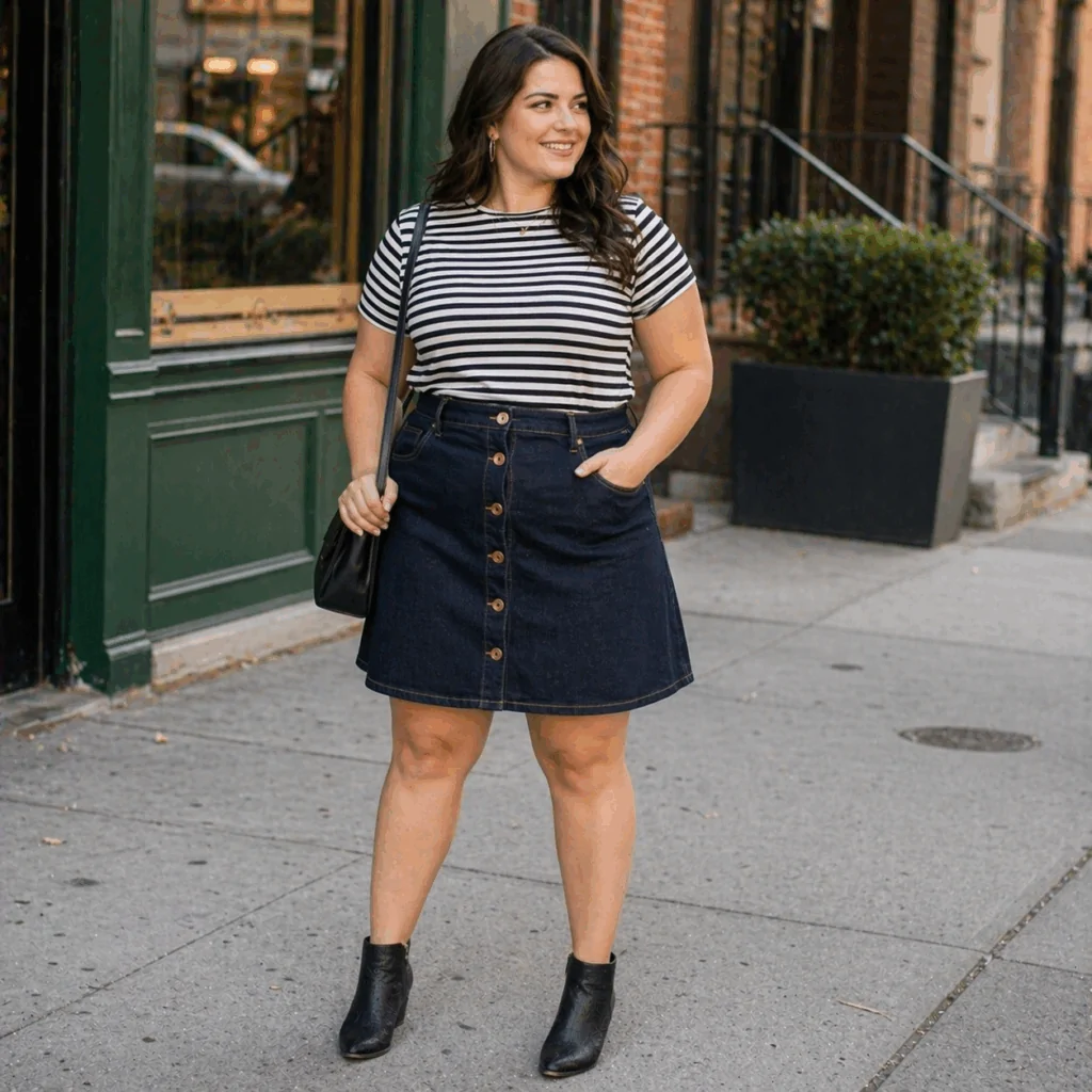 A classic black and white striped tee tucked into a dark denim A-line skirt with ankle boots creates a foolproof casual outfit that works for any body type. The horizontal stripes add visual interest while the A-line cut is universally flattering. This is the kind of reliable outfit formula that looks put-together but feels completely comfortable for weekend errands or lunch dates.