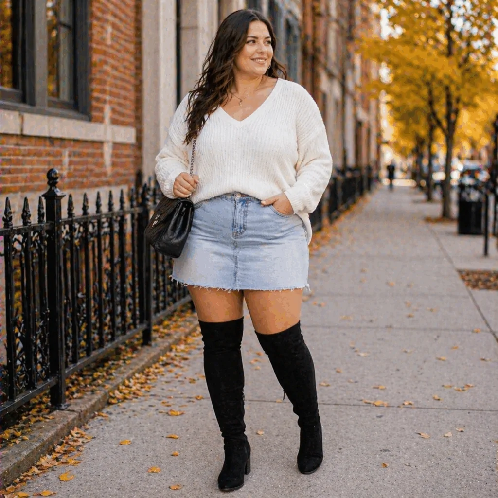 A chunky white V-neck sweater paired with a light wash denim mini skirt and black over-the-knee boots creates a perfect balance of cozy and sexy. The textural contrast between the soft knit and structured denim works beautifully, while the boots add drama and leg-lengthening appeal. This outfit is ideal for women who want to show some skin while staying warm during cooler months.