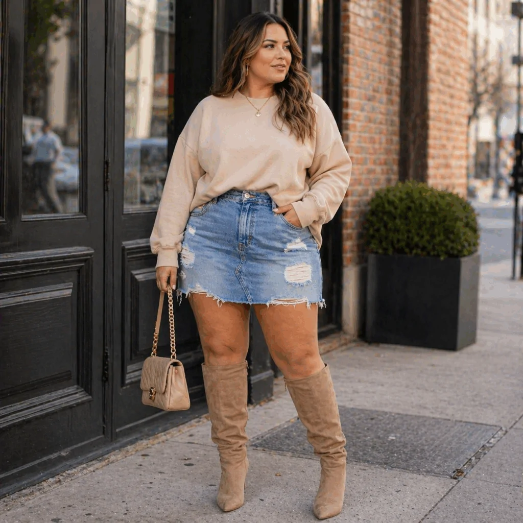 An oversized beige sweatshirt tucked into a high-waisted distressed denim mini skirt with knee-high boots creates an effortless street style look that’s both trendy and comfortable. The relaxed-fit top balances the fitted skirt perfectly, while the distressed details add edge. This combination proves that comfort and style don’t have to be mutually exclusive.