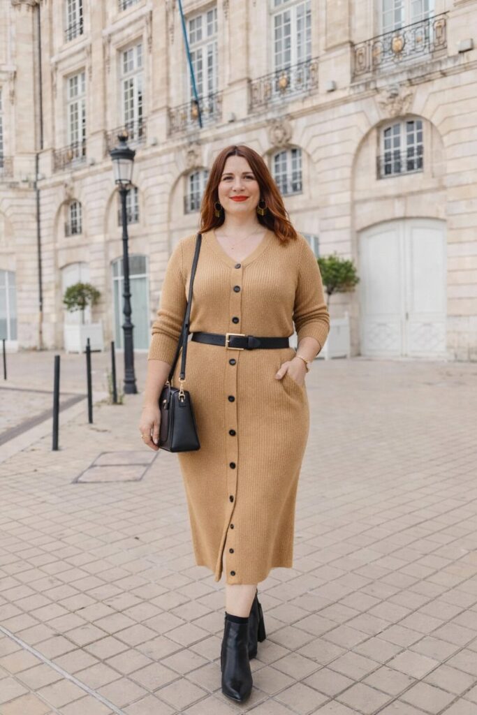 A ribbed knit dress in camel offers warmth and stretch while maintaining a professional silhouette. The button-front detail adds structure to what could otherwise read as too casual, while the black belt creates waist definition. This works perfectly for days when you’re moving between the office and external meetings.