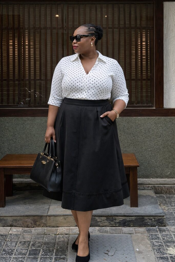 A white polka dot blouse tucked into a charcoal A-line skirt with black trim detail offers a playful yet professional aesthetic. The A-line silhouette is universally flattering while the polka dots add a touch of whimsy to traditional workwear. This outfit works particularly well for those in education or client-facing roles where approachability is key.
