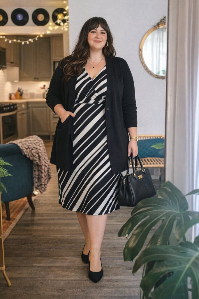 A black and white diagonal striped dress layered under a black cardigan creates a dynamic work ensemble. The diagonal stripes are more slimming than horizontal ones while the cardigan provides coverage and professionalism. This combination is ideal for conservative office environments where you need to look polished but want to incorporate pattern.