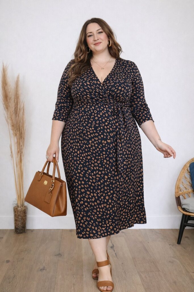 A spotted wrap dress in navy and tan proves that plus size workwear doesn’t require solid colours to look professional. The midi length hits at the perfect spot to work with block heels, while the wrap silhouette creates definition without a belt digging into your waist. Choose darker backgrounds with smaller prints for meetings where you want pattern without distraction.