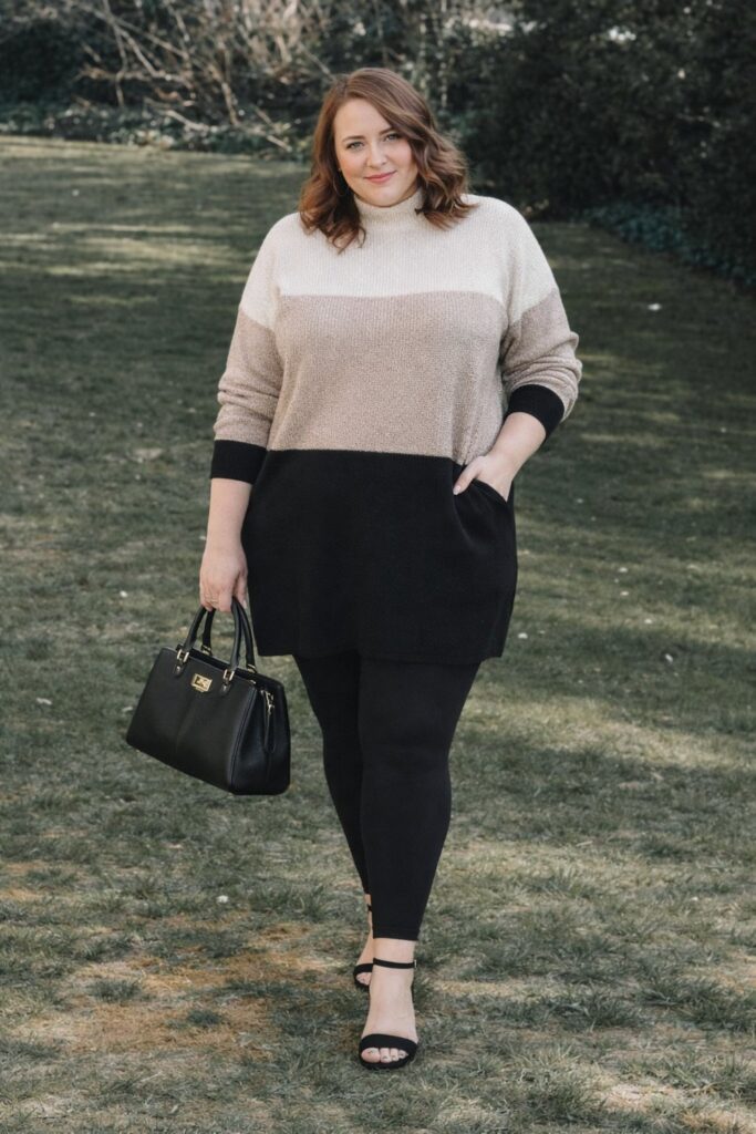 Knit separates prove that comfort and professionalism can coexist, especially in hybrid work environments. This structured colour-block design looks intentional rather than casual, while the longer length provides coverage when sitting. Black leggings ground the neutral palette and work with most shoe choices.