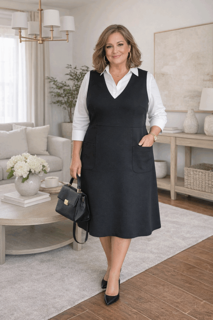 This sleeveless black dress worn over a crisp white shirt is brilliant layering that actually serves a purpose. The apron-style dress gives you the comfort of loose-fitting clothing while the fitted shirt underneath maintains structure near your face. I’ve adopted this approach because it solves the coverage issue without sacrificing style — you get the polish of a dress with the practicality of separates. Choose apron dresses in ponte or structured knits that hold their shape.