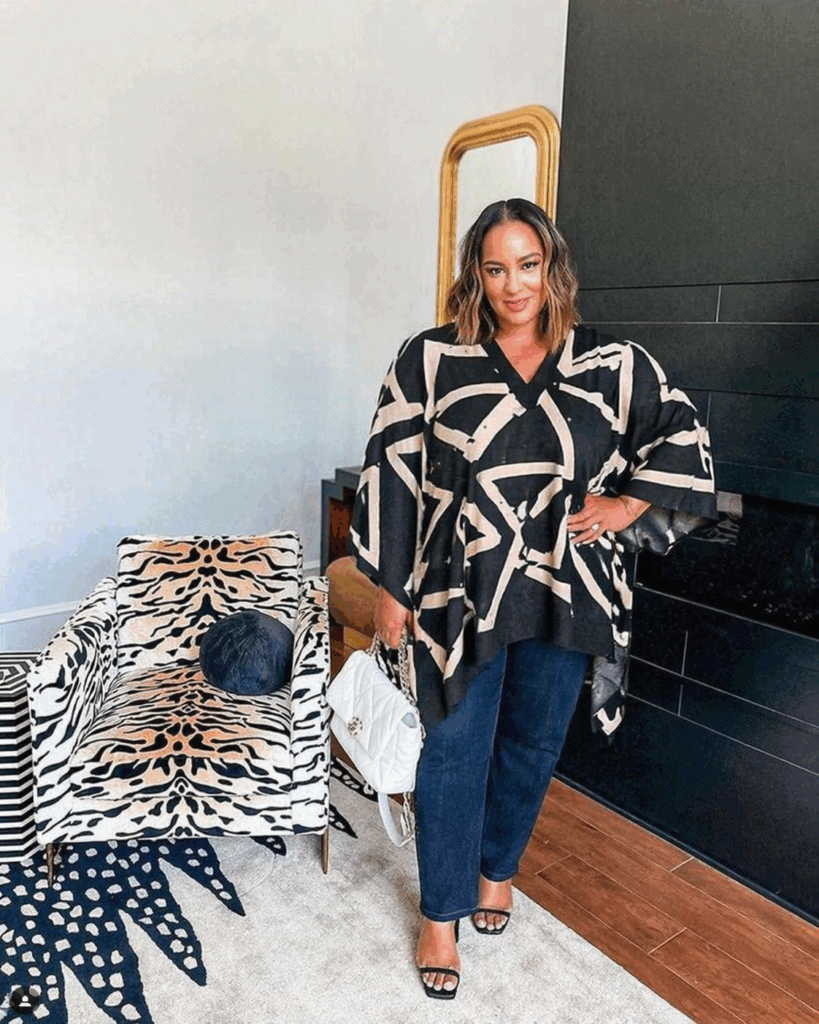 A structured poncho in bold geometric patterns paired with dark wash straight-leg jeans creates a modern casual look that balances comfort with style. The poncho’s structured shape avoids the shapeless trap that often comes with this silhouette. This combination works well for weekend activities and casual social events where comfort is key but polish is still desired.