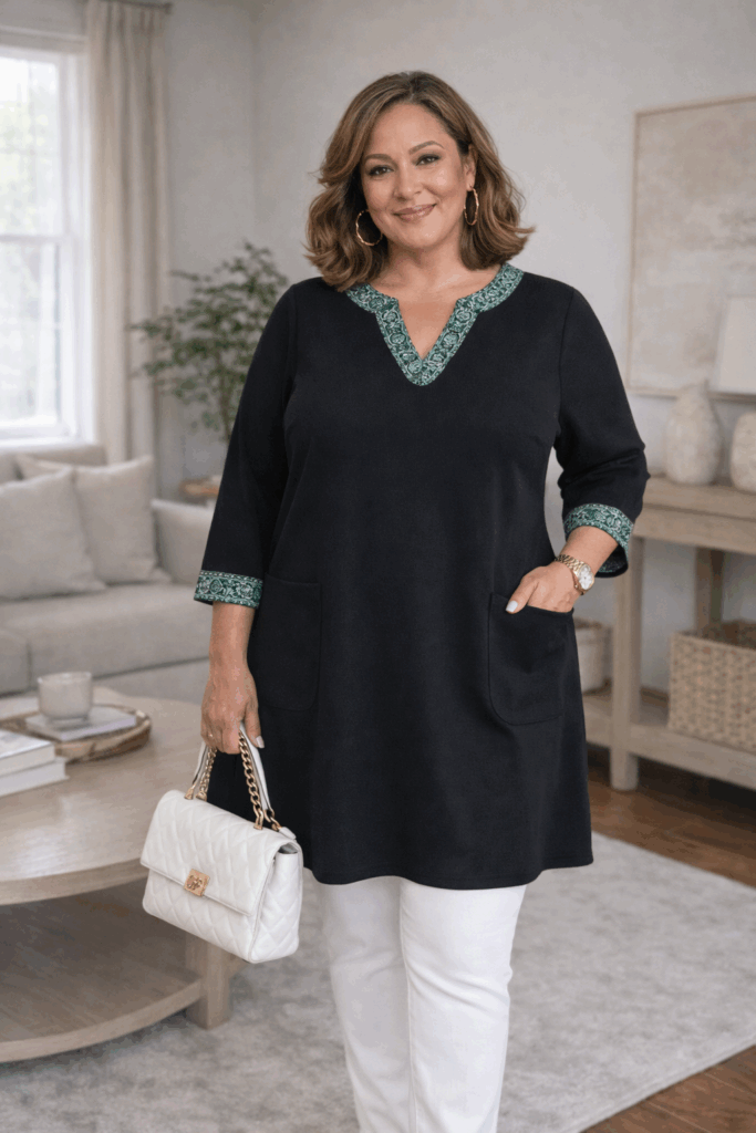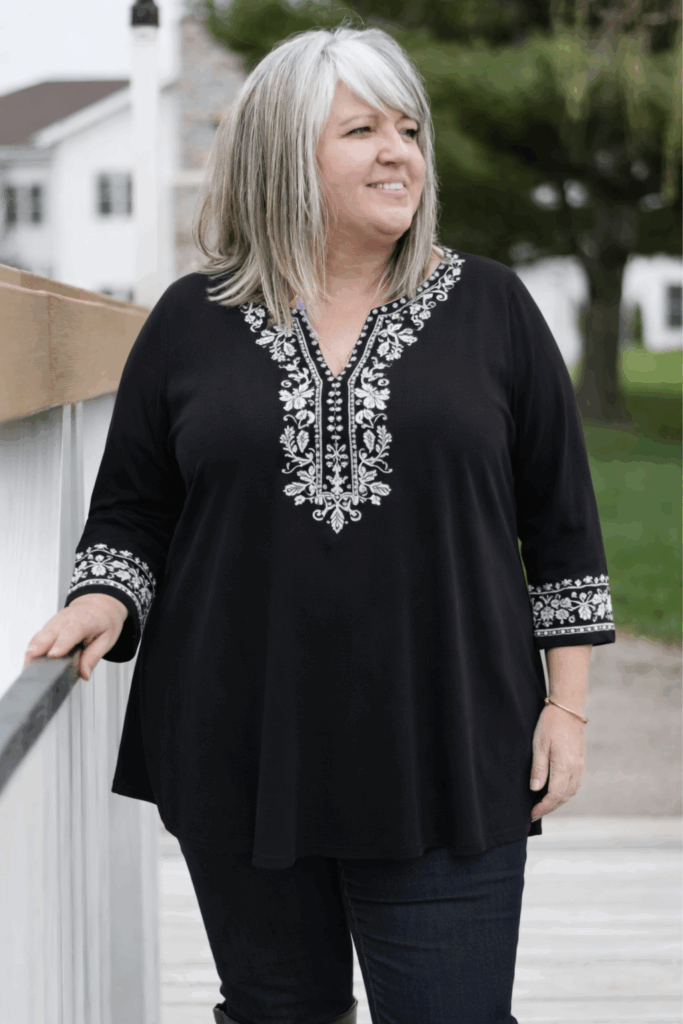 The three-quarter sleeves and intricate white embroidery on this black tunic create visual interest while the longer length provides coverage through the hip area. Paired with dark straight-leg jeans and tall boots, this combination offers comfort without sacrificing style. This look is ideal for casual outings where you want to feel put-together but relaxed.