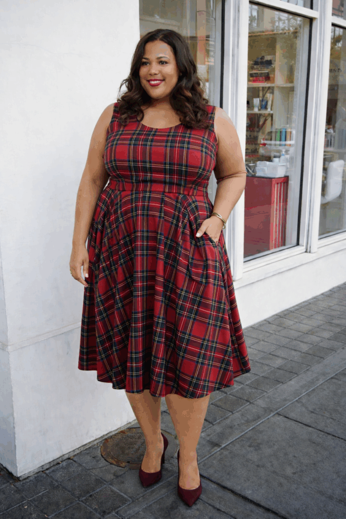 A sleeveless fit-and-flare dress in classic tartan creates a defined waist with controlled fullness through the skirt, flattering fuller figures while maintaining a playful, vintage-inspired aesthetic. The knee-length hem and structured bodice provide coverage and support. This style proves that traditional patterns can feel fresh when executed in the right silhouette for your body type.
