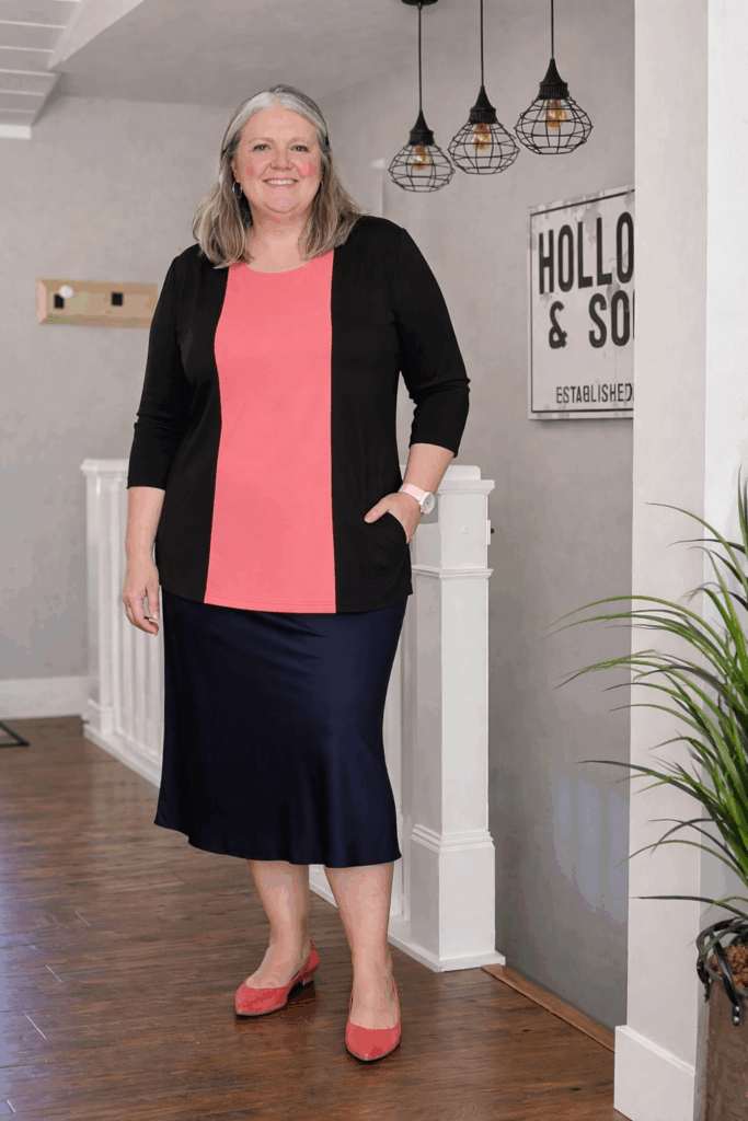 This burgundy cardigan and tank combination shows how matching separates can create the polish of a dress with more versatility. The deeper red tone is more forgiving than bright colors and works beautifully with this woman’s coloring. The structured fit of both pieces creates a put-together look that’s professional yet comfortable.