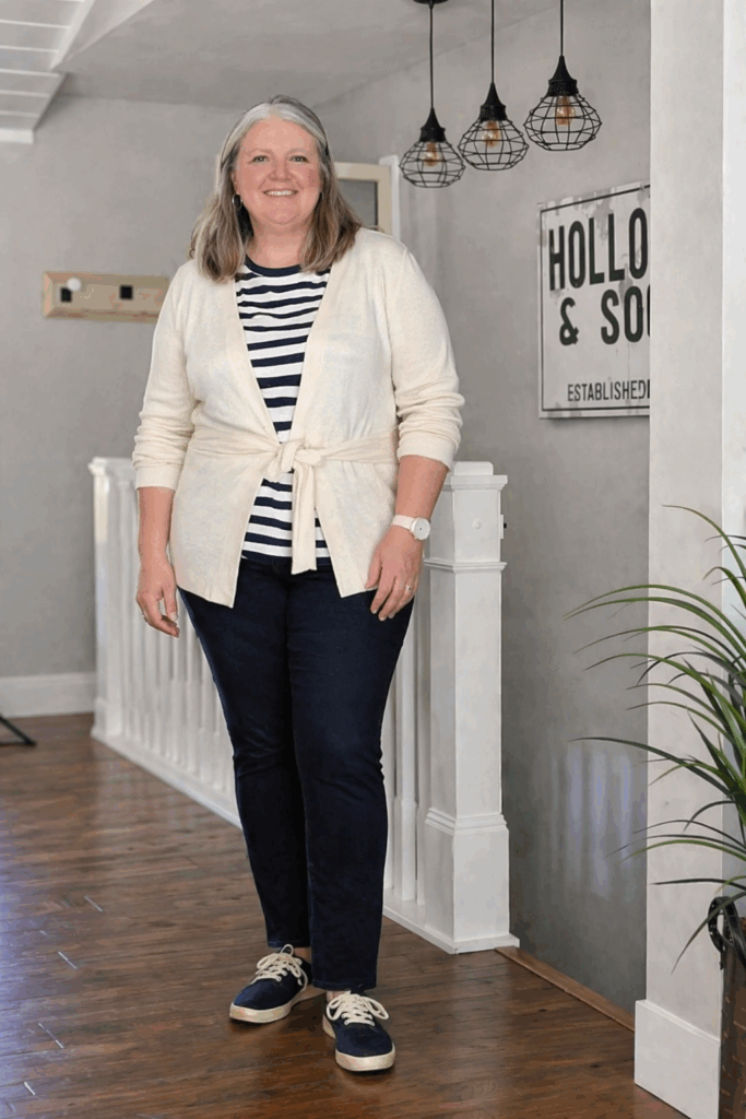 The classic navy and white striped top becomes more polished when paired with a cream cardigan tied at the waist. This styling trick creates definition at the narrowest part of the torso while the cardigan adds structure to the casual striped tee. The blue canvas shoes tie the whole look together for a cohesive, comfortable ensemble.