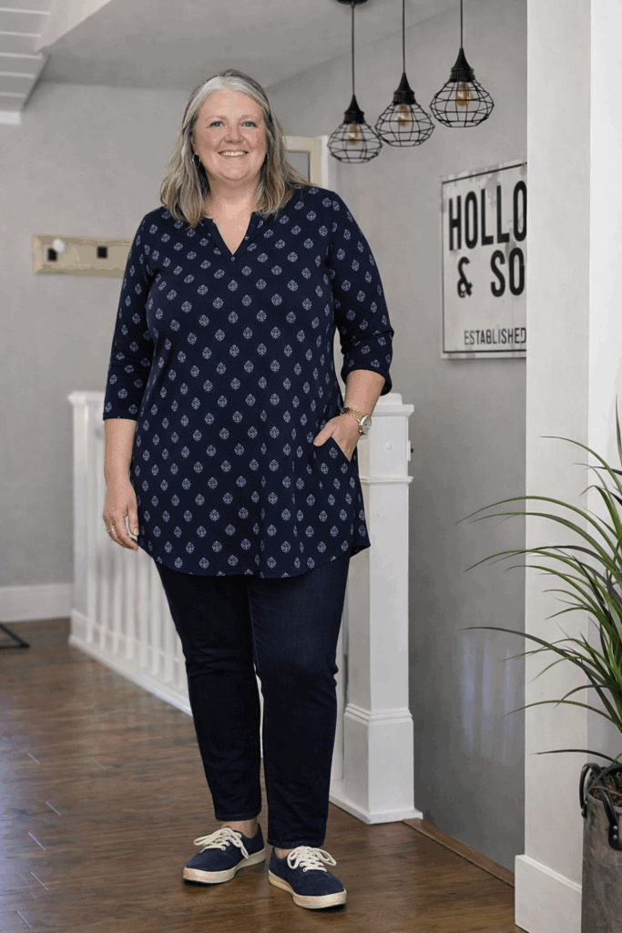This navy tunic with small white medallion prints offers excellent coverage through the hips while the V-neckline creates a flattering focal point. The three-quarter sleeves provide arm coverage without feeling restrictive, and the curved hemline adds visual interest. Perfect for women who want comfort without sacrificing style in their everyday wardrobe.