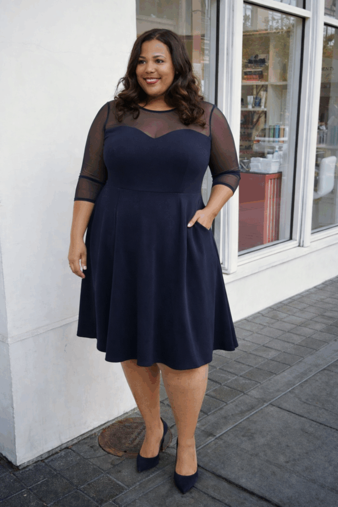 A navy dress featuring strategic mesh panels at the neckline and sleeves adds visual interest and a touch of allure while maintaining overall coverage. The fitted silhouette through the torso with a flared skirt creates classic hourglass proportions. This approach to evening wear offers sophistication with subtle sexiness, perfect for dinner dates and special occasions.