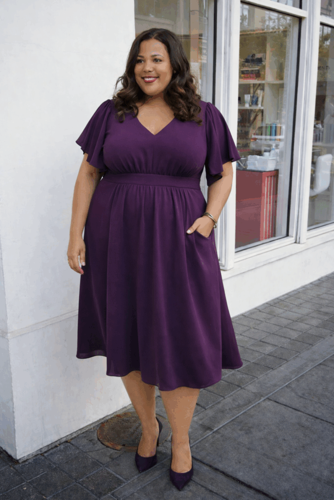 A midi dress with flutter sleeves and empire waist creates a romantic silhouette that skims over the midsection while the flowing fabric moves beautifully. The rich purple color is both vibrant and sophisticated. This style works particularly well for women who prefer looser fits but still want shape definition, offering comfort without sacrificing femininity.