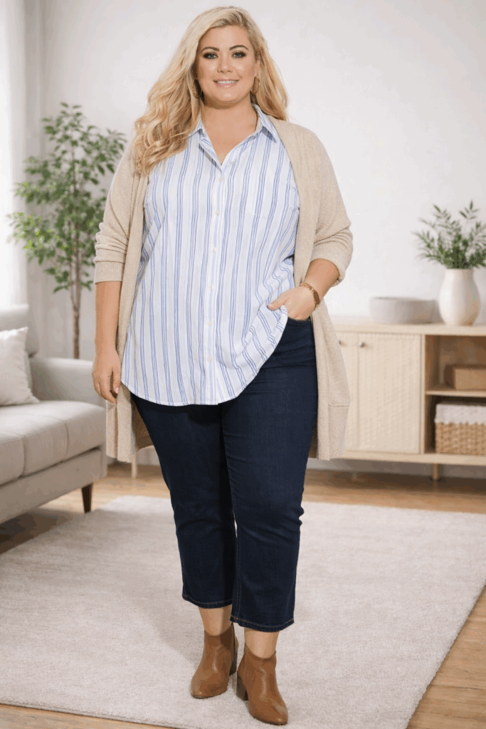 This oversized striped shirt paired with dark cropped jeans creates a relaxed yet put-together look that works beautifully for plus-size women. The shirt’s loose fit skims the body without clinging, while the vertical stripes add visual length. Complete the look with brown ankle boots and a structured cardigan for errands or casual outings.