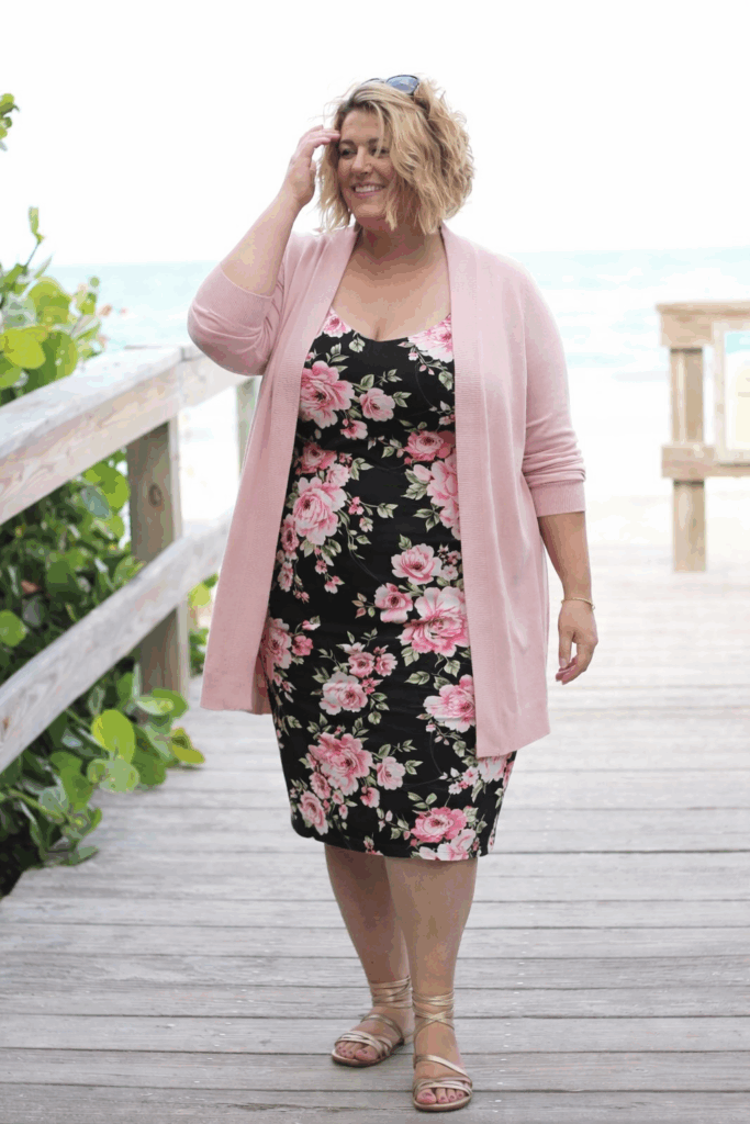 The pink cardigan picks up the pink tones in the floral dress while providing coverage and structure over the fitted silhouette. Color coordination between layers makes this look intentional rather than thrown together. This styling approach works well for women who love bodycon dresses but want the option to add coverage for different settings.